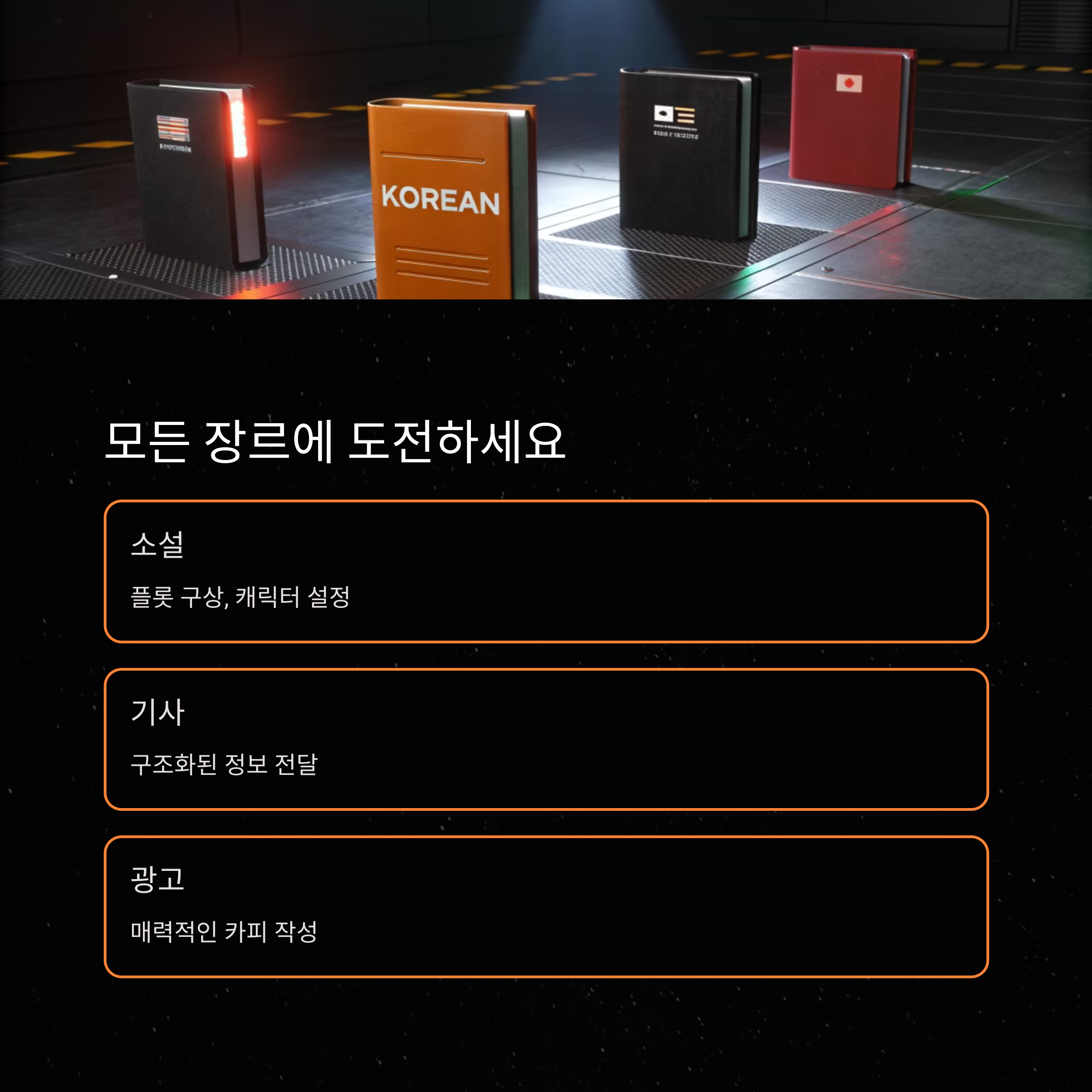 이제 **소설, 기사, 광고 등 다양한 글쓰기에 적용하는 방법**을 알아볼까요? 😊