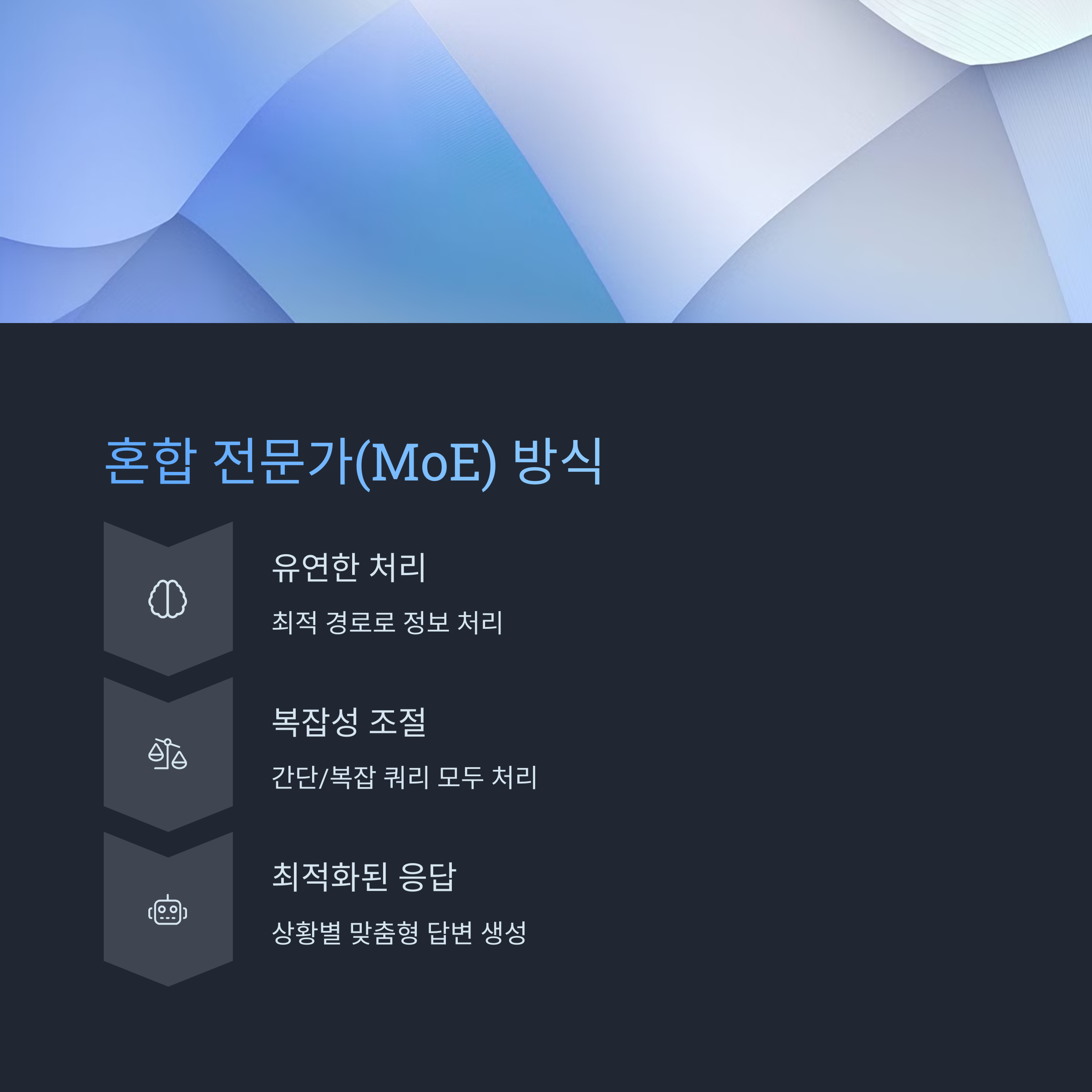 MoE 구조는 하나의 AI 모델 내에 여러 개의 ‘전문가’ 네트워크를 탑재해, 입력 질문에 따라 가장 적합한 전문가 모듈을 선택해 응답하게 만드는 구조입니다. 이를 통해 불필요한 계산을 줄이면서도 높은 정답률을 유지할 수 있습니다. 라마4는 이러한 구조를 적용하여 다양한 분야의 질문을 보다 정확하고 유연하게 처리할 수 있게 되었습니다.