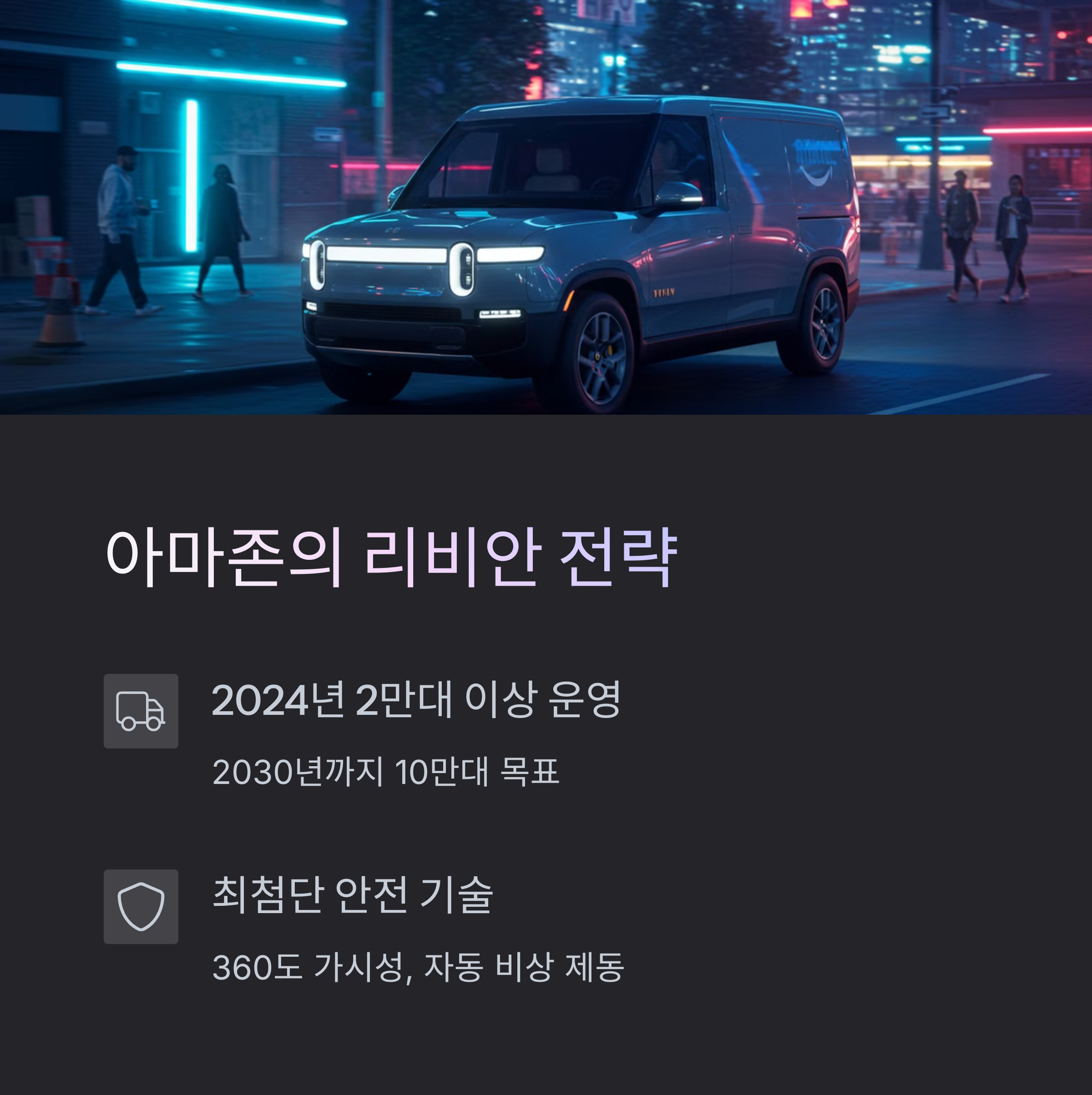 게다가 아마존은 리비안을 통해 전기 픽업트럭, SUV 등 소비자용 차량 시장으로도 확장을 꾀하고 있어요. 차량 생산뿐만 아니라 아마존 AI 기술을 활용한 자율주행 기술 탑재도 병행 중이에요.