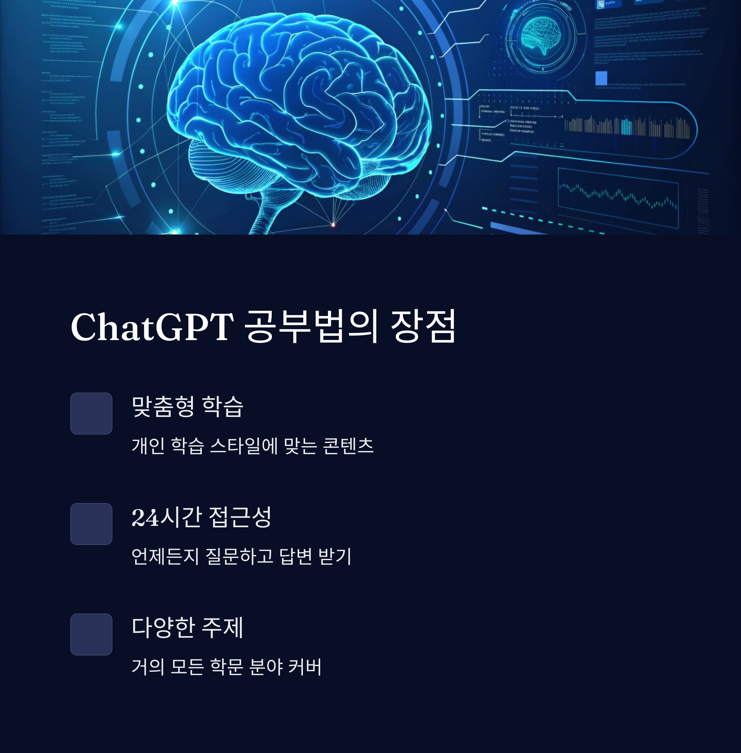 이런 장점들이 모여서 ChatGPT는 단순한 검색 도구가 아니라, 나만의 디지털 공부 파트너가 되어줘요. 특히 다양한 학습자에게 맞춤형으로 사용할 수 있다는 점이 정말 매력적이죠.