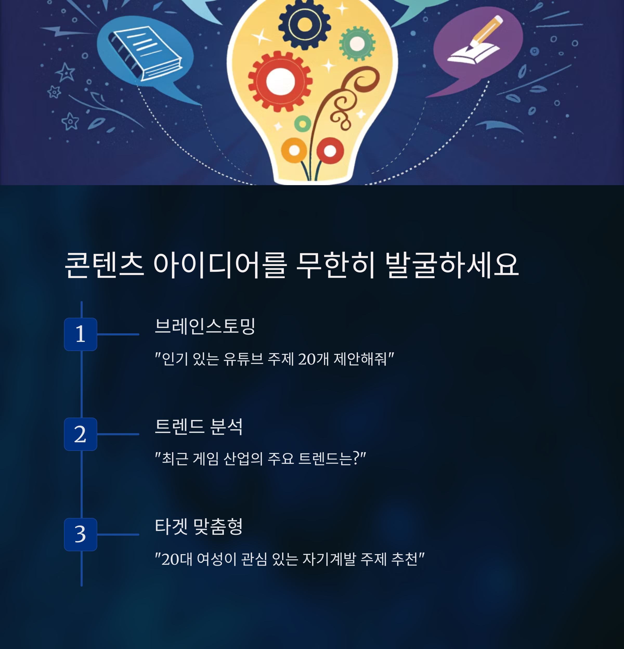 - 융합적 접근: 기존의 인기 포맷에 AI가 제시하는 신선한 시각을 결합하여 친숙하면서도 독창적인 콘텐츠를 개발하세요.